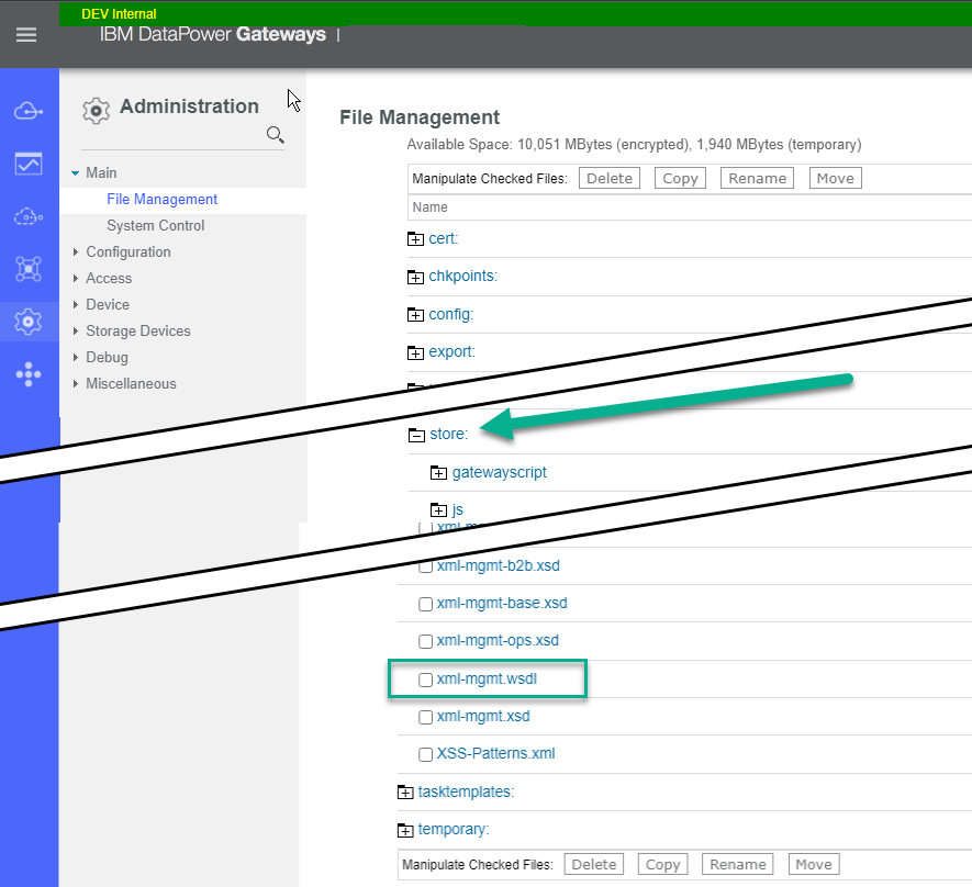 You can download the SOMA and AMP WSDL’s directly from the DataPower appliance or instance. Log onto DataPower and navigate to the Administration menu. Under the Main submenu, select the File Management option.