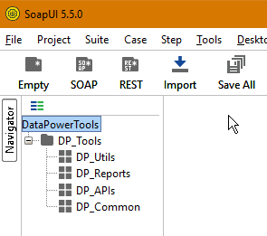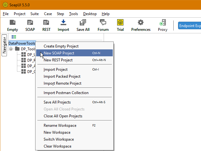 - Right-click on the workspace name and select “New SOAP Project”. Enter a project name of “DP_Tools”