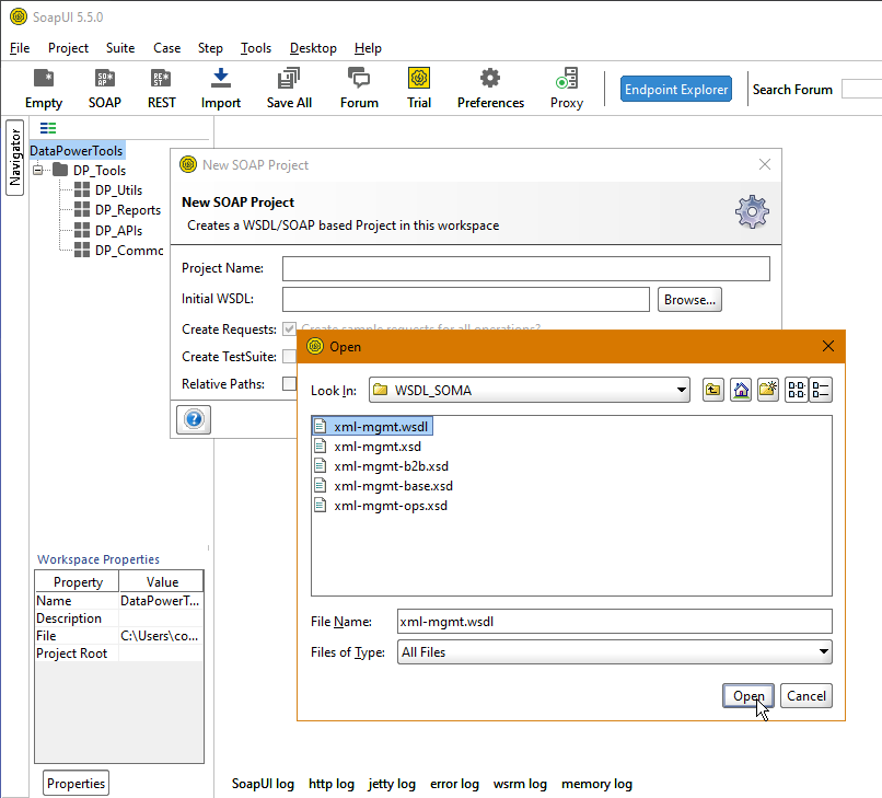 Now it’s time to add the actual service WSDL’s to SoapUI. You do this by right-clicking on the workspace name and selecting New Soap Project. Be sure to right-click on the workspace name “DataPowerTools” and not the project “DP_Tools”. This is because we are going to import the full WSDL’s as their own projects and select which API’s we will be using as we need them.