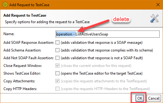 You will then be presented with the “Add Request to TestCase” window. You will note how it adds “operation -” to the front of the request name. You can remove that so the name remains “ListActiveUsersSoap”. Uncheck any of the other boxes that may be checked by default (some you cannot uncheck, that’s OK) and press “OK”.
