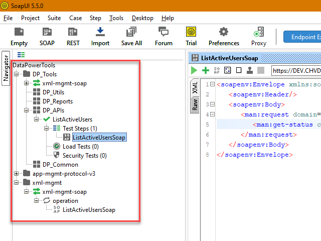We’re doing great so far. But even though we have a working SOAP call, it is still in its own soapUI project (xml-mgmt). So now, we are going to create a new test case under the “DP_APIs” test suite in our “DataPowerTools” project. This is where all of our re-usable api calls will live.