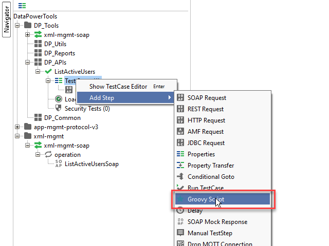 - Right-click on “Test Steps” and select “Add Step –> Groovy Script”