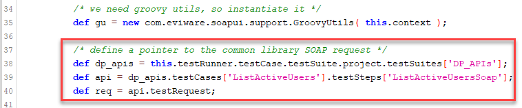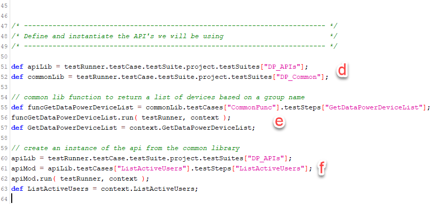 Next is where we define and instantiate our common API and function. First, we define variables that point to the common API and common function TestSuites, “DP_APIs” and “DP_Common” respectively (d).