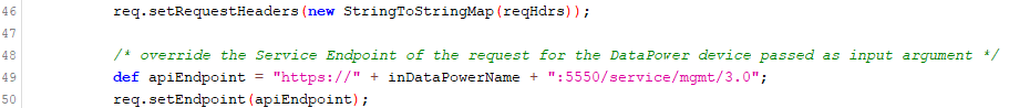 So the last thing we need to do before executing the SOAP call is to override the SOAP request endpoint to send the request to the right DataPower device. This is the equivalent of the drop-down endpoint box at the top of the SOAP request test step. We use the string that is passed in as an argument to concatenate the connection string. The argument can be the DNS name of the device, the IP address of the device, or the name you associated with the devices IP address in your hosts file (more on this later). After we have the connection string, we use the .setEndpoint() method of the request object to assign the string as the endpoint for the call.