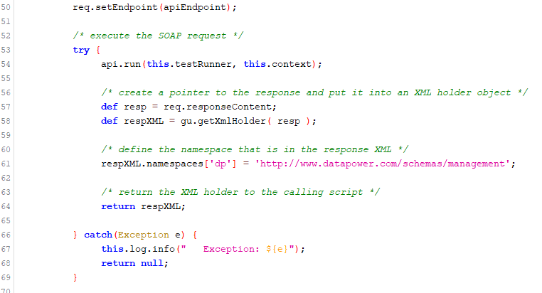 (e) runAPI() method. This is where we actually execute the SOAP call. IE: the utility or report script will invoke this method each time it wants to make the ListActiveUsersSoap call. We will add the required code for that in a moment, but you can immediately see that we will need to pass in a DataPower device name as the argument for each execution. You can also see that we need to instantiate a GroovyUtils object based on the current context of the script that is calling this method. GroovyUtils is necessary in order to pass the SOAP response XML back to the calling script as an object.