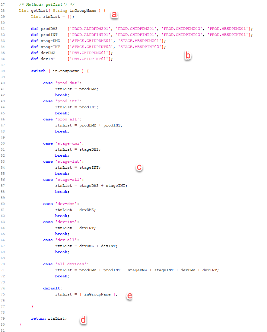 As you can see, the function will return a list[] holding the names of DataPower devices (a). We first create separate lists holding the names of the devices in our most oft used groupings (b). If those names confuse you, check out my other tutorial on setting up better soapUI endpoints. Or you can just put in the IP Addresses of your DataPower devices in similar groupings.