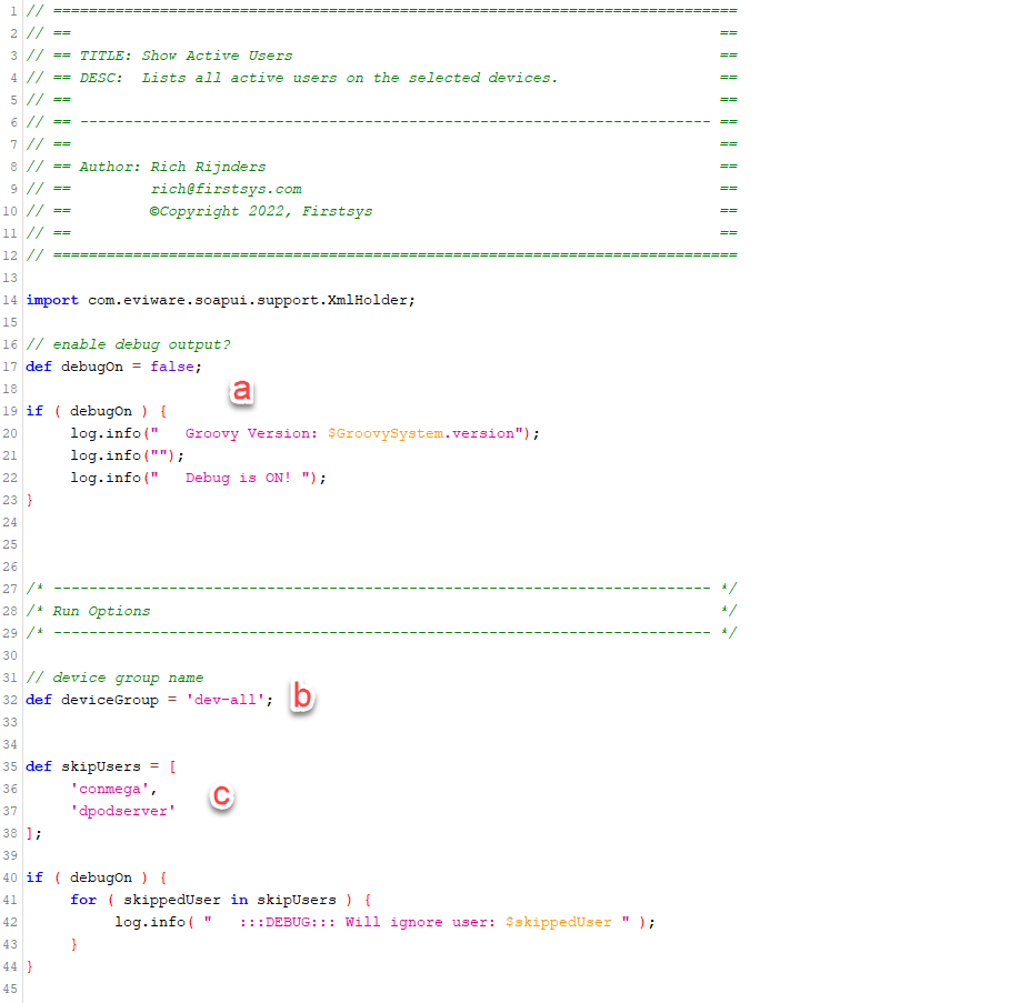 Along with your own user ID, there are usually other user ID’s, created for logging and monitoring accessing the device. These will also be returned every time you run the API. we are not interested in those usually, so we add a list of user ID’s that will be ignored when generating the output (c).