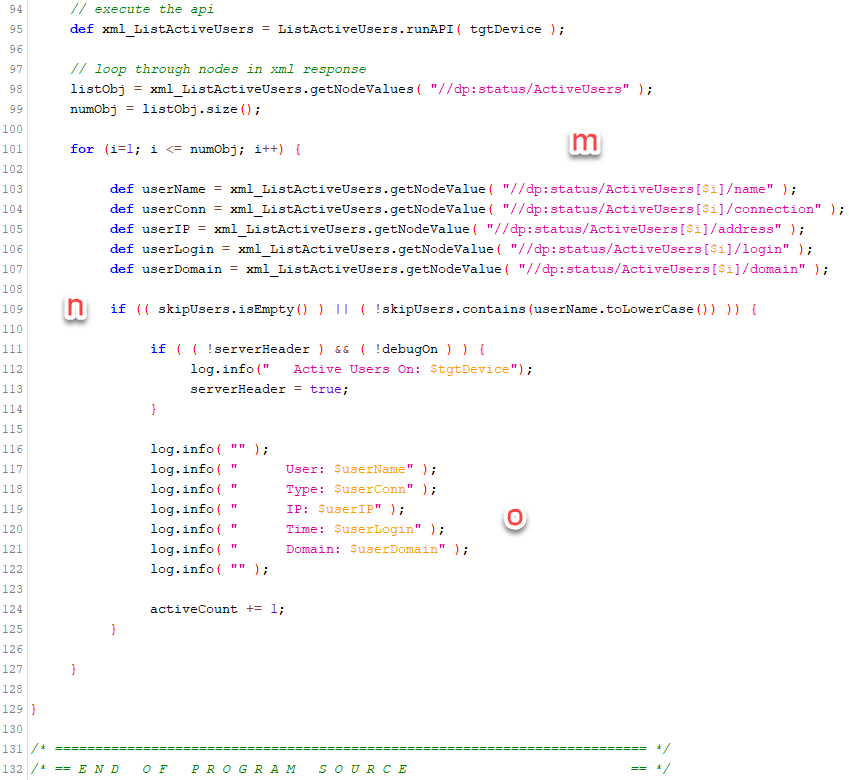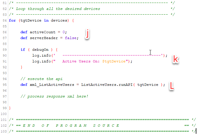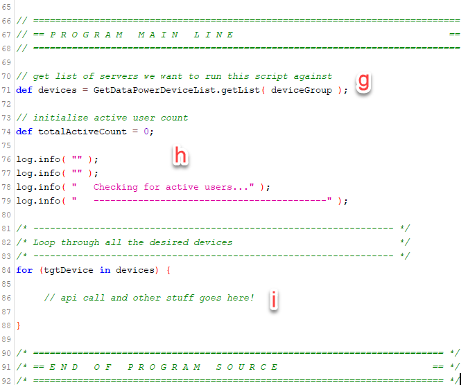 (i) This is where most of our work takes place. This loop iterates through the list of DataPower device names that we retrieved from our common function. This is where we will execute the common API to check for active users on all of desired devices. We will insert and discuss that code next.