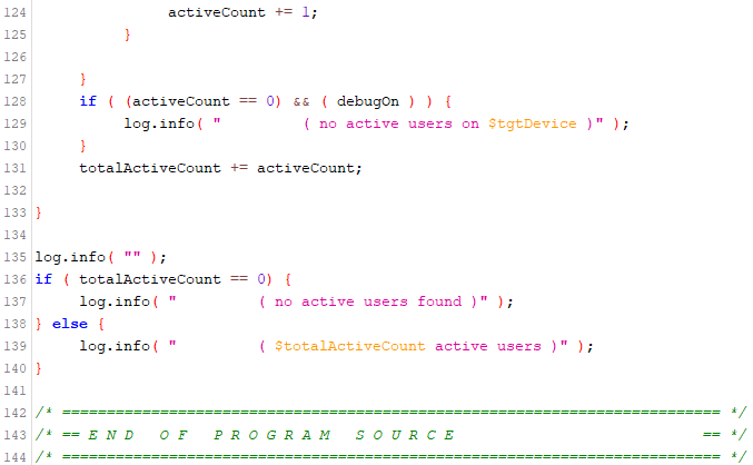 So let’s add some code inside this loop that will execute for each DataPower device. First we just initialize some working variables (j). The first one is just a counter to keep track of how many active users we found on this device. The second is just a flag to let my code know if I have output a header message for this device yet.